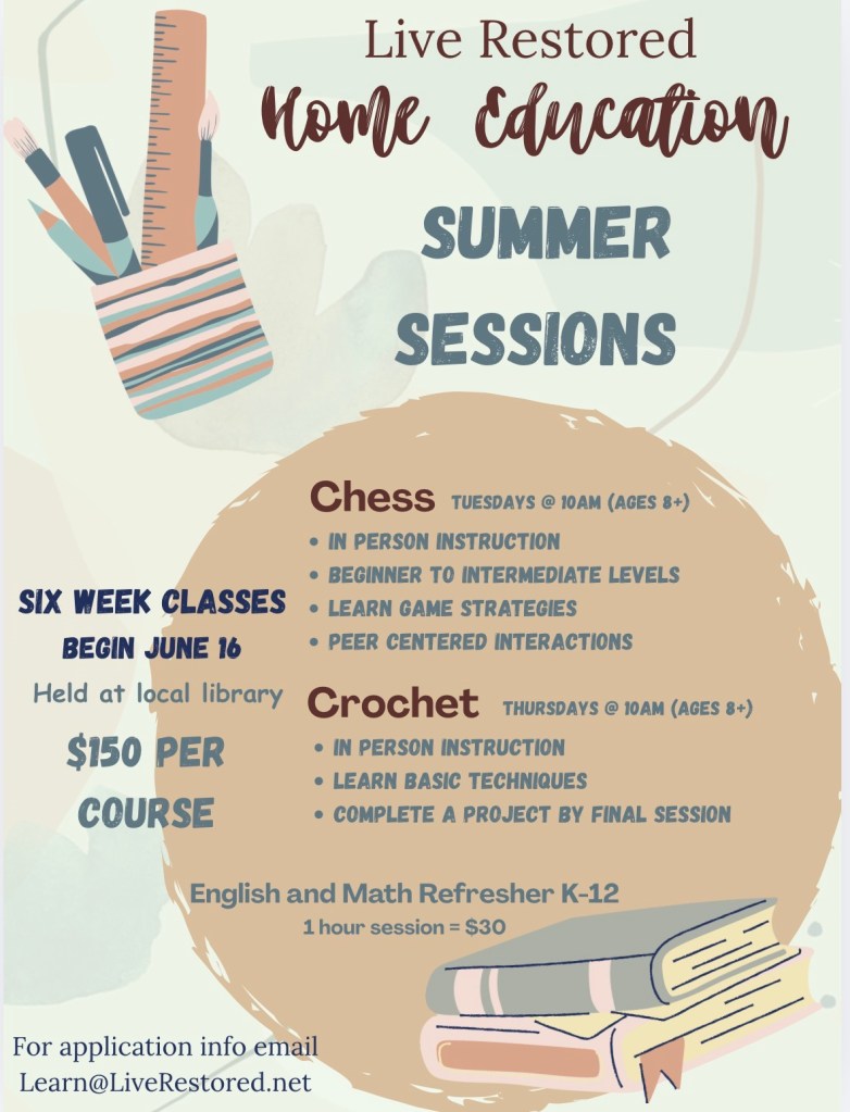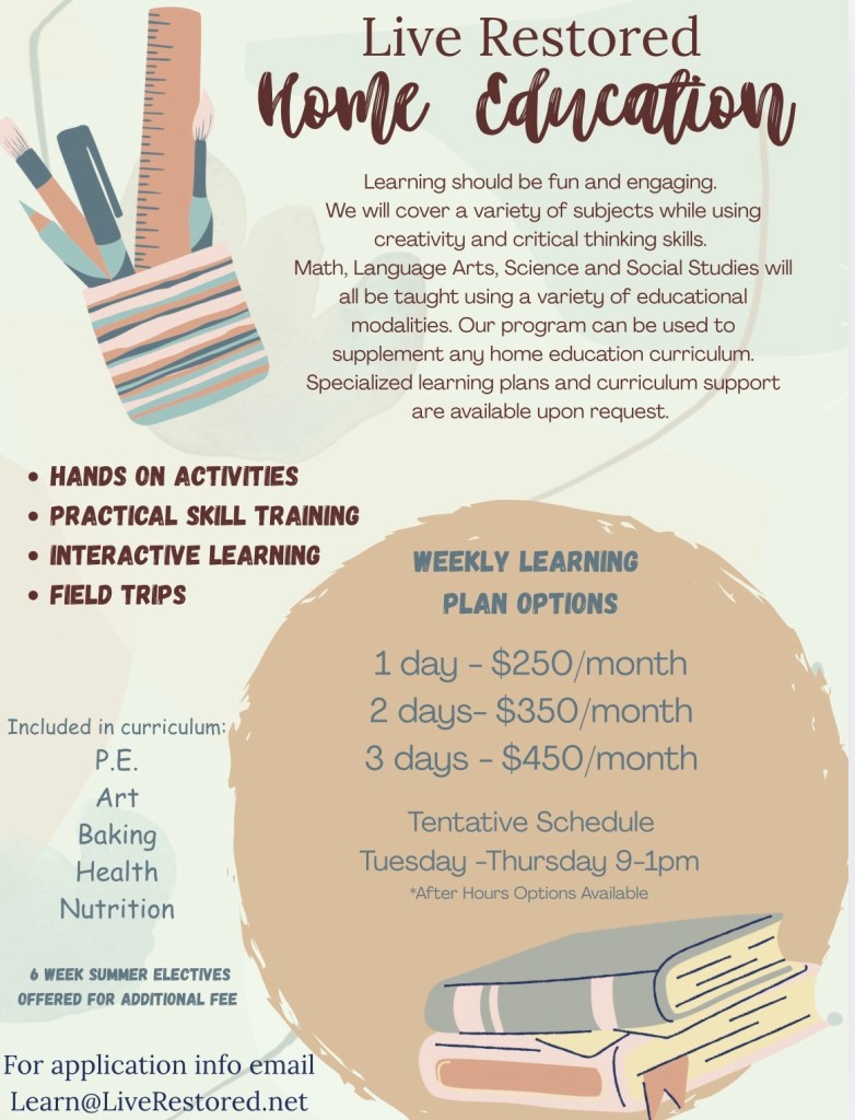 Home Education Program Email Learn@LiveRestored.net for application Share this: Share on X (Opens in new window) X Share on Facebook (Opens in new window) Facebook Like Loading...
